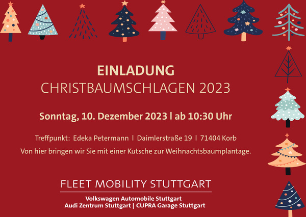 Diese Karten sind für Sie persönlich bestimmt und nicht übertragbar. Bitte beachten Sie, dass diese Einladung und der Gutschein für einen Christbaum unter dem Vorbehalt der Genehmigung durch Ihren Arbeitgeber ausgesprochen wird. Tragen Sie bitte Sorge dafür, dass Sie evtl. notwendige Genehmigungen entsprechend der in Ihrem Hause geltenden Regularien einholen. Die Audi Stuttgart GmbH sowie die Volkswagen Automobile Stuttgart GmbH übernimmt gem. § 37b Einkommensteuergesetz im Zusammenhang mit dieser Einladung gegebenenfalls anfallende Steuern auf unentgeltliche Sachzuwendungen. Eine mögliche steuerliche Belastung wird von uns damit abgegolten.